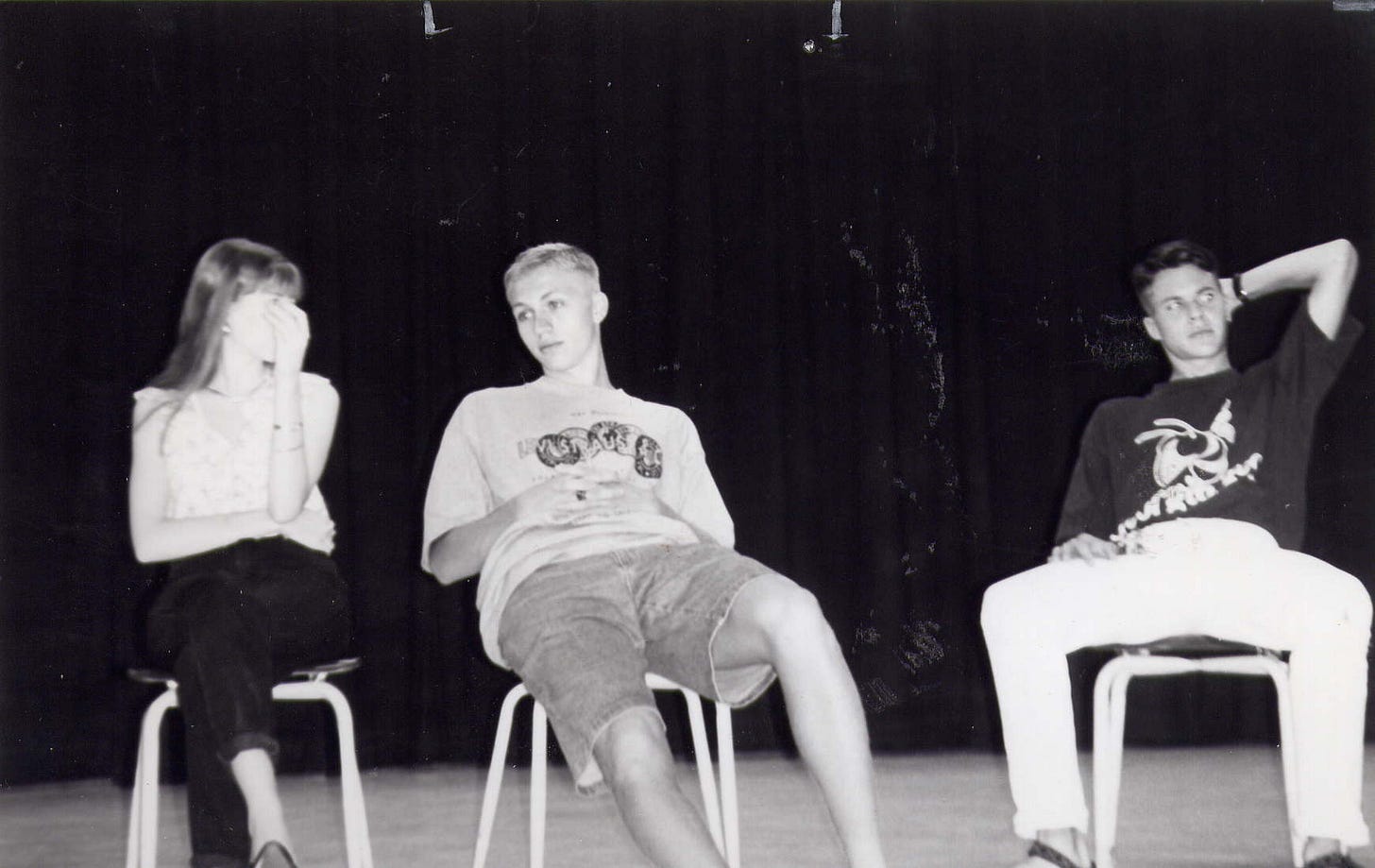 Here we are on stage for something—I think this photo sums up both of us in high school.
